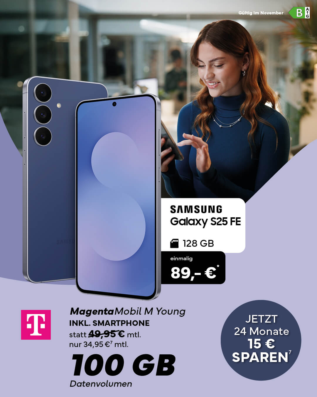 Ab sofort bekommst du das Samsung Galaxy S25 FE im MagentaMobil M Young Tarif mit 100 GB Datenvolumen ganze 24 Monate lang 15 € günstiger. 🤩