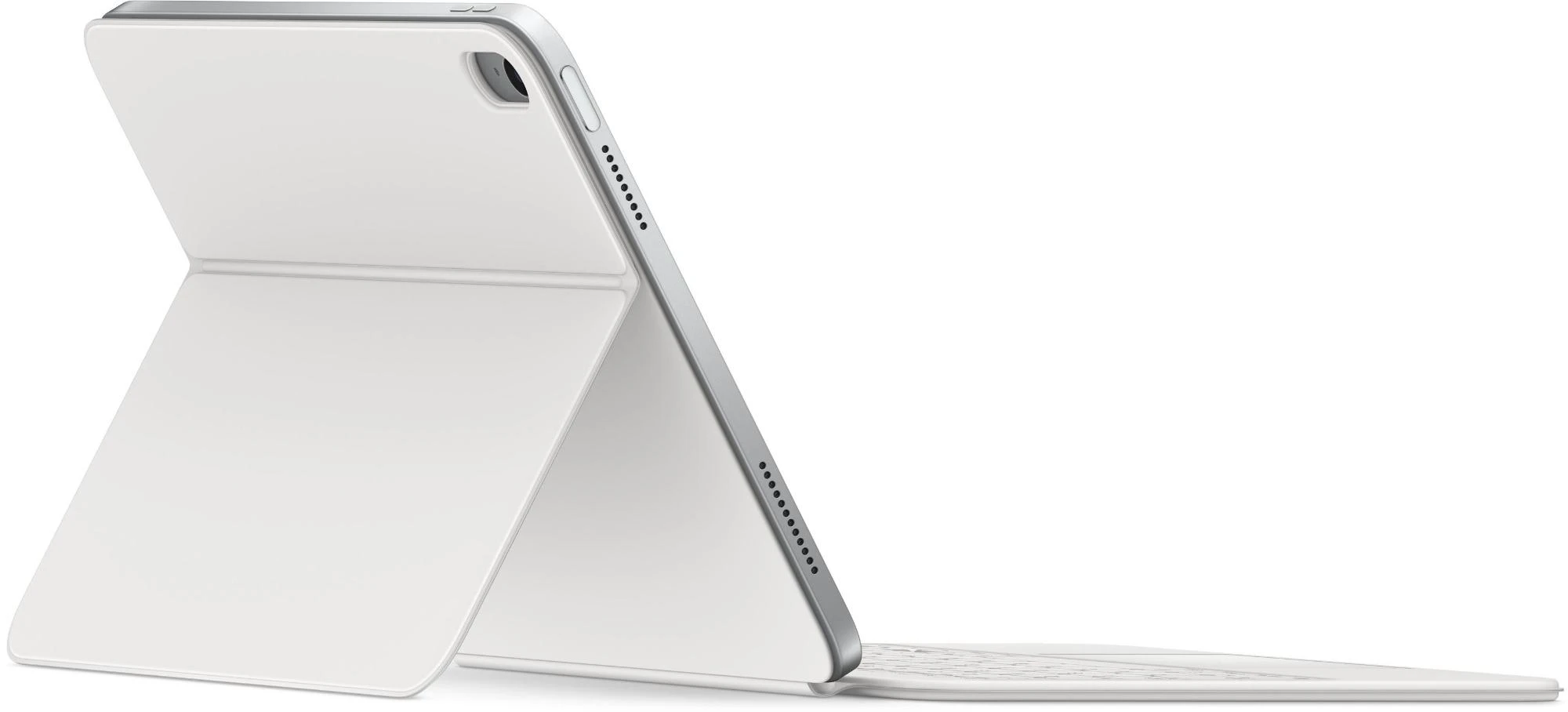 Mit dem Magic Keyboard Folio kannst du angenehm tippen und mit einem großen Trackpad arbeiten. Pass schnell die Lautstärke an oder such eine Datei über die Reihe mit Funktionstasten. Das flexible zweiteilige Design kommt mit einer abnehmbaren Tastatur. Die schützende Rückseite hat eine verstellbare Stütze für verschiedene Betrachtungswinkel