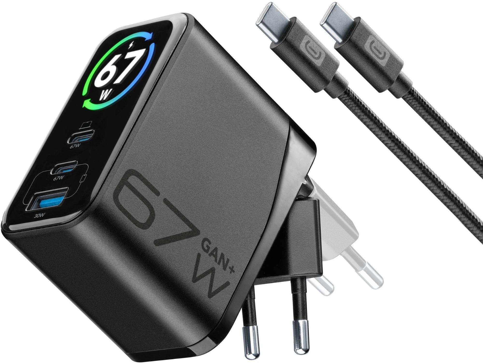 Das PowerView IQ 67W Wandladegerät-Set gehört zur neuen Produktreihe von Cellularline, die für hohe Leistung, volle Kontrolle und maximalen Komfort entwickelt wurde. Das integrierte Smart-TFT-Display ermöglicht die Echtzeitüberwachung der Ladeparameter jedes Anschlusses, einschließlich abgegebener Leistung, Wattzahl und Temperatur, und gewährleistet so Transparenz und Sicherheit während der Nutzung. Ausgestattet mit zwei 67W USB-C-Anschlüssen, einem 30W USB-A-Anschluss und einem 150 cm langen 5A/100W USB-C-Kabel (im Lieferumfang enthalten) ermöglicht es das gleichzeitige Laden mehrerer Geräte. Die GaN+-Technologie sorgt für hohe Leistung in einem kompakten Design, während der klappbare Stecker die Tragbarkeit verbessert und das Ladegerät beim Transport schützt.